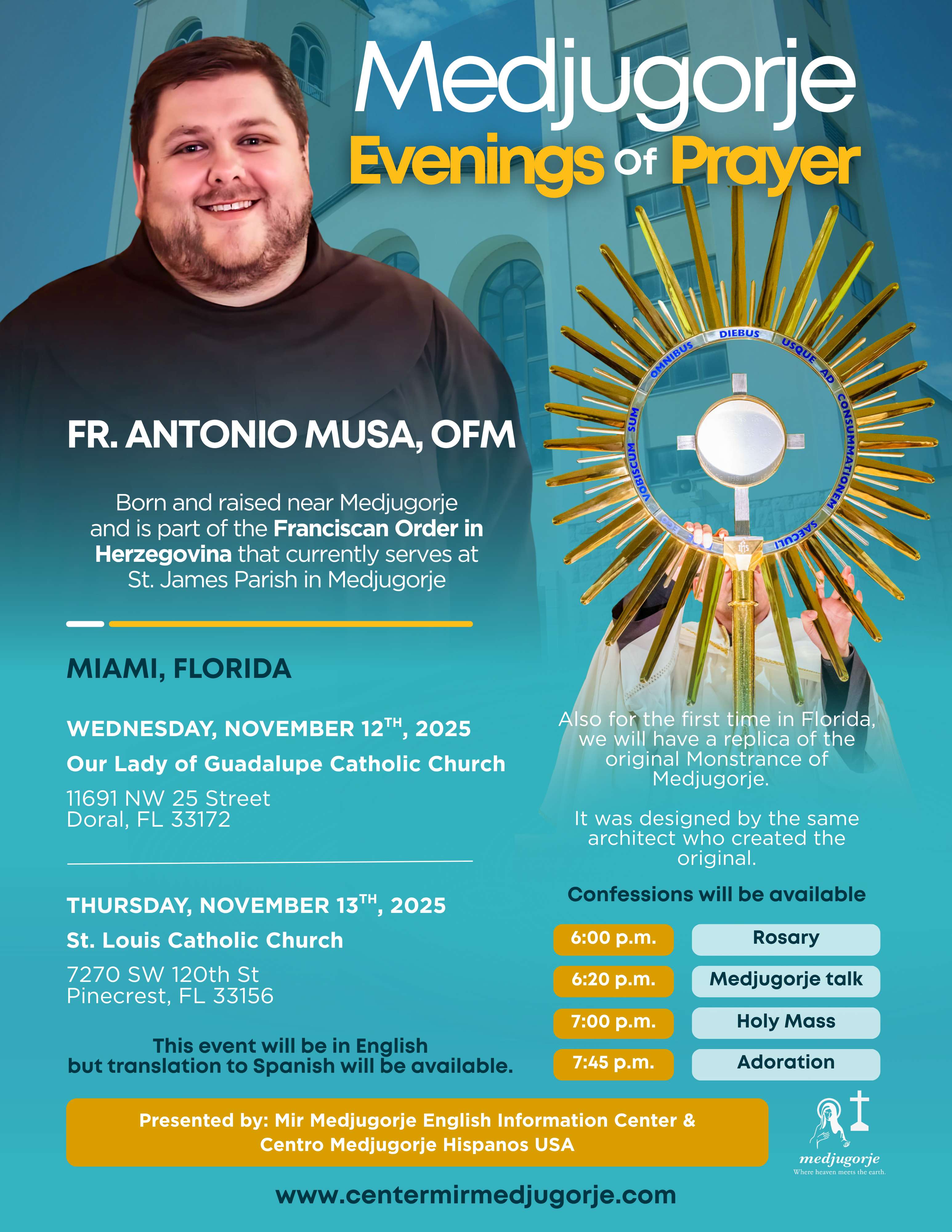 Mir Medjugorje English Information Center and Centro Medjugorje Hispanos USA are delighted to announce the Medjugorje Evenings of Prayer coming to Miami, Florida, this November.
