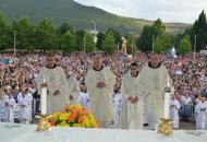 The 33rd Anniversary of Our Lady’s Apparitions was solemnly celebrated in Medjugorje on Wednesday, June 25, 2014. Along with many local pilgrims from Bosnia and Herzegovina, as well as Croatia, there were bigger groups from Italy, Hungary, Germany, France, Ireland, the United States, Romania, China, Vietnam, Puerto Rico, Slovenia, Poland, Belgium, Slovakia, Korea, Switzerland, Austria, Australia, Spain, Albania, Brazil, Hong-Kong, Mexico, Ukraine, Lebanon, Canada, Columbia, Lithuania, Latvia, Sri Lanka, Argentina, Uruguay and Uganda. Many of these pilgrims, especially young ones, walked to Medjugorje so they would fulfil their vows to the Queen of Peace and thank her for all the graces they received. There were 21 Holy Masses celebrated during the day and the central evening prayer programme began at 6 p.m. with Rosary and Holy Mass at 7 p.m. Fr. Branimir Musa, parish priest from Tihaljina, celebrated the solemn Holy Mass with 247 priests who concelebrated. The day before, on the Eve of the Anniversary, Fr. Miro Sego celebrated Holy Mass with 188 priests that concelebrated. The traditional 23rd Peace Walk took place on June 24 and it started in Humac, shrine of St. Anthony to the church of St. James in Medjugorje. (photos)