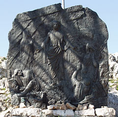 Pogled prema nebu razdijeljen je na tri križa i u središtu se okomiti podiže Krist. Isus, nakon što je povjerio Majku sinu i sina Majci, obraća se Ocu na nebesima: «Oče, oprosti im jer ne znaju što čine.» Riječi svete, dovoljne da vrate nadu u srca ljudi. Nakon dubokog uzdaha Isus umire. Nebo se pomračuje, zemlja se trese, strah je zahvatio nazočne. Prvi su pobjegli oni koji su mrzili i ranjeni, zahvaćeni u svojemu strahu. Marija se klanja i grli Križ, ljubi probodene noge svoga Isusa u dubokom činu ljubavi. Ivan, najvjerniji, nastoji joj pružiti utjehu ali ne odvraća svog pogleda od ljubljenog Učitelja. Samo je Majka s nekoliko najvjernijih ostala pod Križem. U dnu, zavijene u svoje plašteve, plaču Marija Magdalena i Marija Kleofina.