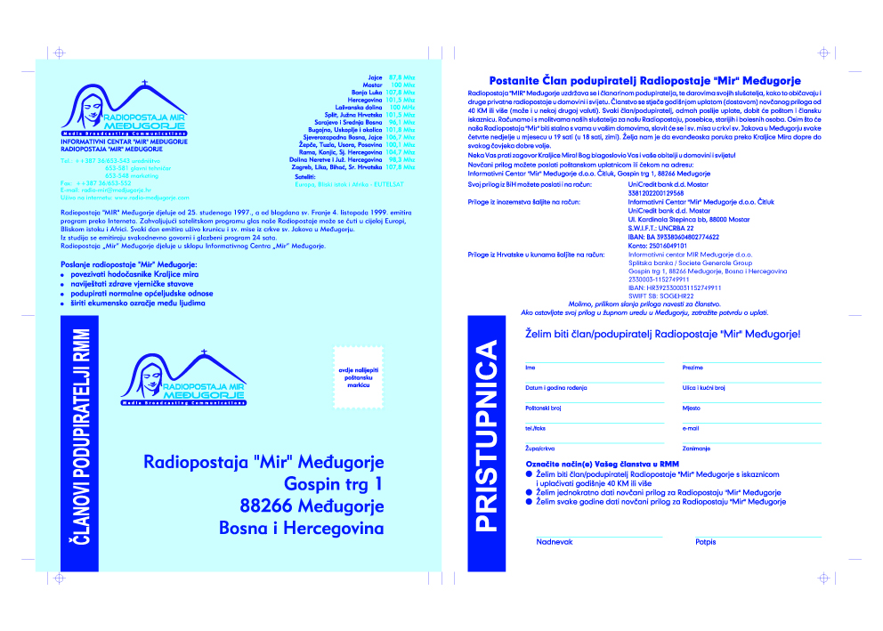 Ovom uplatnicom može se uplaćivati u Švicarskoj članarina ili donacija za radio Mir, ali i za Glasnik Mira. Sada se uplatnicom može dobiti u Hrvataskoj katoličkoj misiji Zuerich.