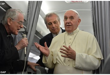 Apostoli útja befejeztével Ferenc pápa hazatérőben, a repülőgép fedélzetén találkozott az újságíróknak és válaszolt kérdéseikre. A szóvivő ezúttal is P. Federico Lombardi volt a Vatikáni Rádió főigazgatója. Az első kérdés az Egyház a međjugorjei jelenésekkel kapcsolatos döntésére vonatkozott.