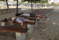 A Medjugorje, durante la celebrazione della Santa Messa serale, tutte le panche poste attorno all'Altare esterno sono piene di fedeli. Ma la foto di questi due giovani, che coricati su di esse sono sprofondati in un sonno profondo, dimostra che le panche risultano utili anche nelle prime ore del mattino. Questi giovani, dopo aver camminato tutta la notte, cosa testimoniata anche dai piedi scalzi di uno di loro, non sono stati svegliati né dal rumore della macchina fotografica né da quello dei nostri piedi sulla ghiaia.