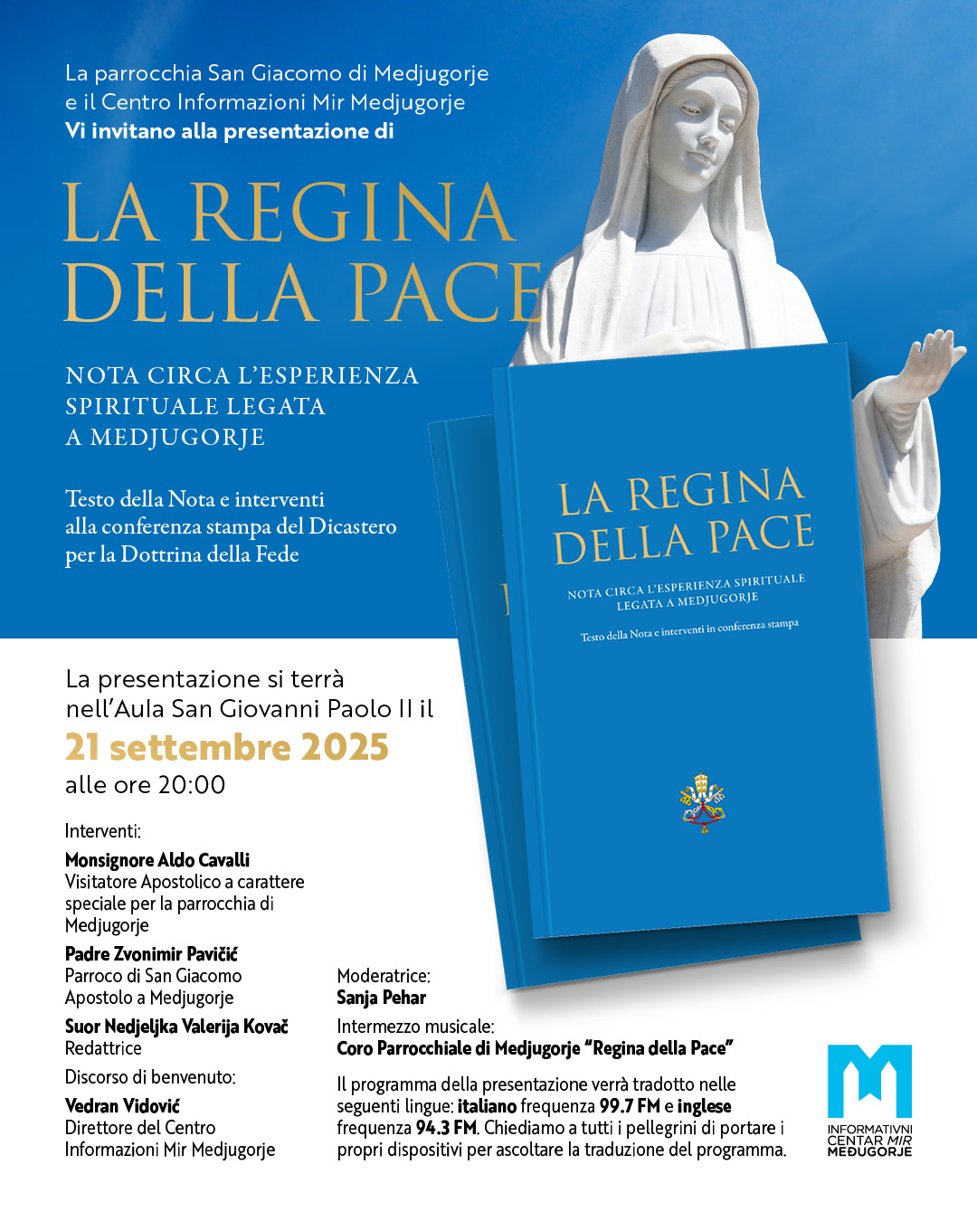 Il libro Regina della Pace – Nota circa l’esperienza spirituale legata a Medjugorje (Testo della Nota e interventi alla conferenza stampa del 19 settembre 2024 in occasione della proclamazione del nihil obstat per Medjugorje)», edito dal Centro Informazioni Mir Medjugorje, sarà presentato domenica 21 settembre alle ore 20.00 nella Sala Giovanni Paolo II.